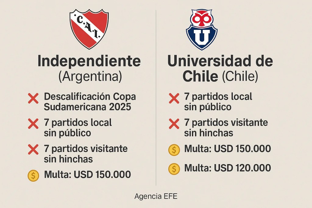 La Conmebol precisó en un comunicado que la eliminación de Independiente de Avellaneda no implica su «exclusión de futuras competiciones», pero sí le obligará a jugar a puerta cerrada los siguientes siete partidos en condición de local en las competiciones auspiciadas por la entidad con sede en Luque.