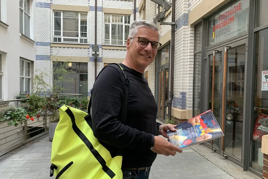 Nacido en la ciudad oriental germana de Leipzig hace 62 años, Jens sonríe al ver impreso en una reciente revista dedicada a los 35 años de la reunificación de Alemania el emblema de la RDA, compuesto por un martillo, un compás y una espiga de trigo.
